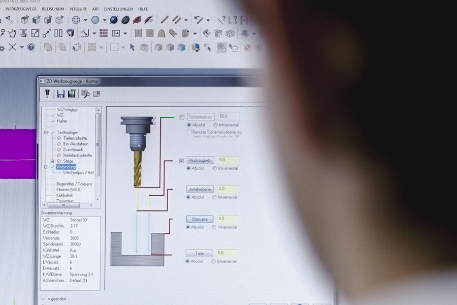Unser modern ausgestatteter Fertigungsbereich verfügt über mehrere CNC Fräsmaschinen und eine CNC Drehmaschine mit angetriebenen Werkzeugen. 5-Achs-Fräsmaschinen stehen zur Fertigung hochkomplexer 3D Konturen zur Verfügung.